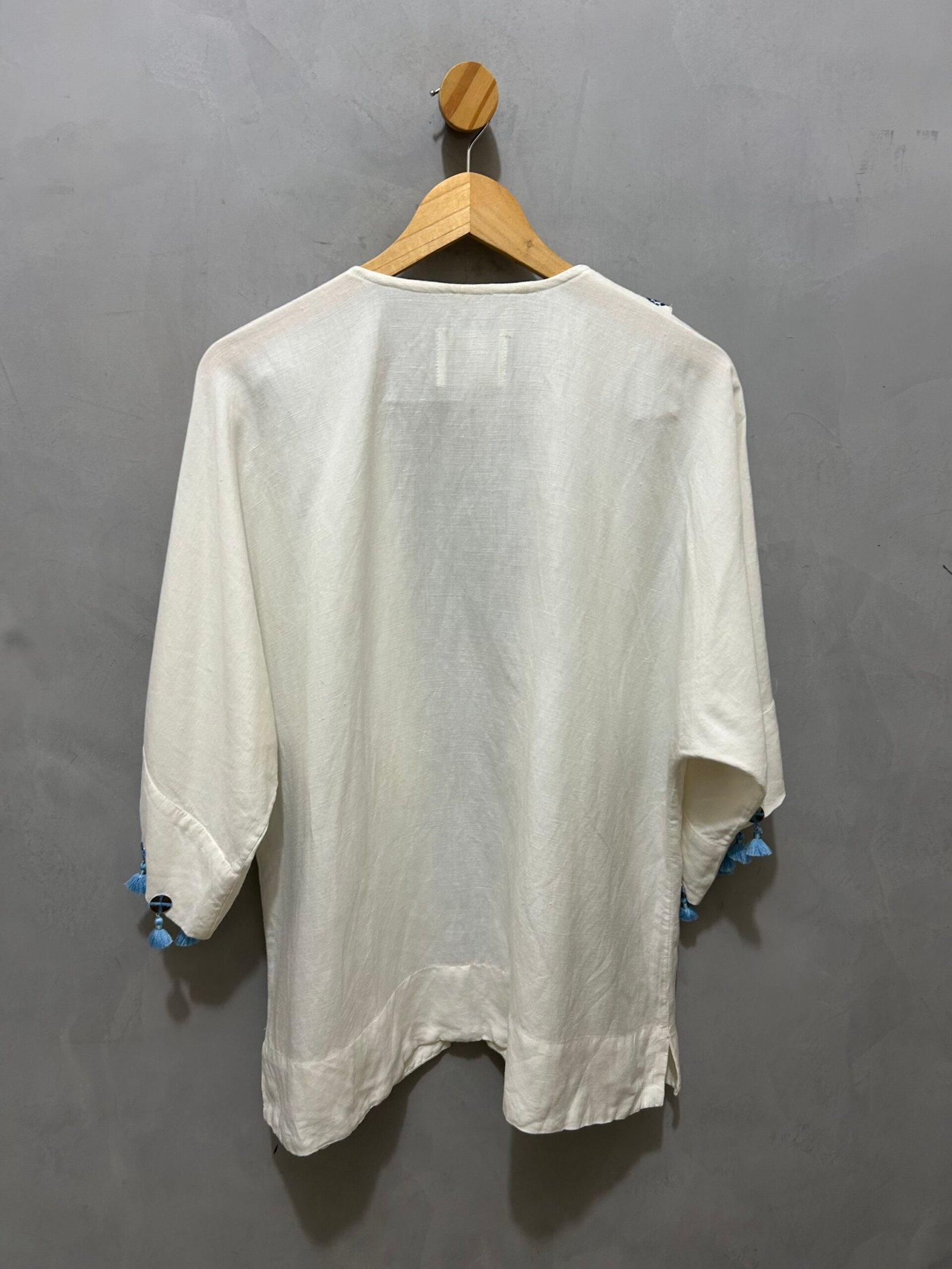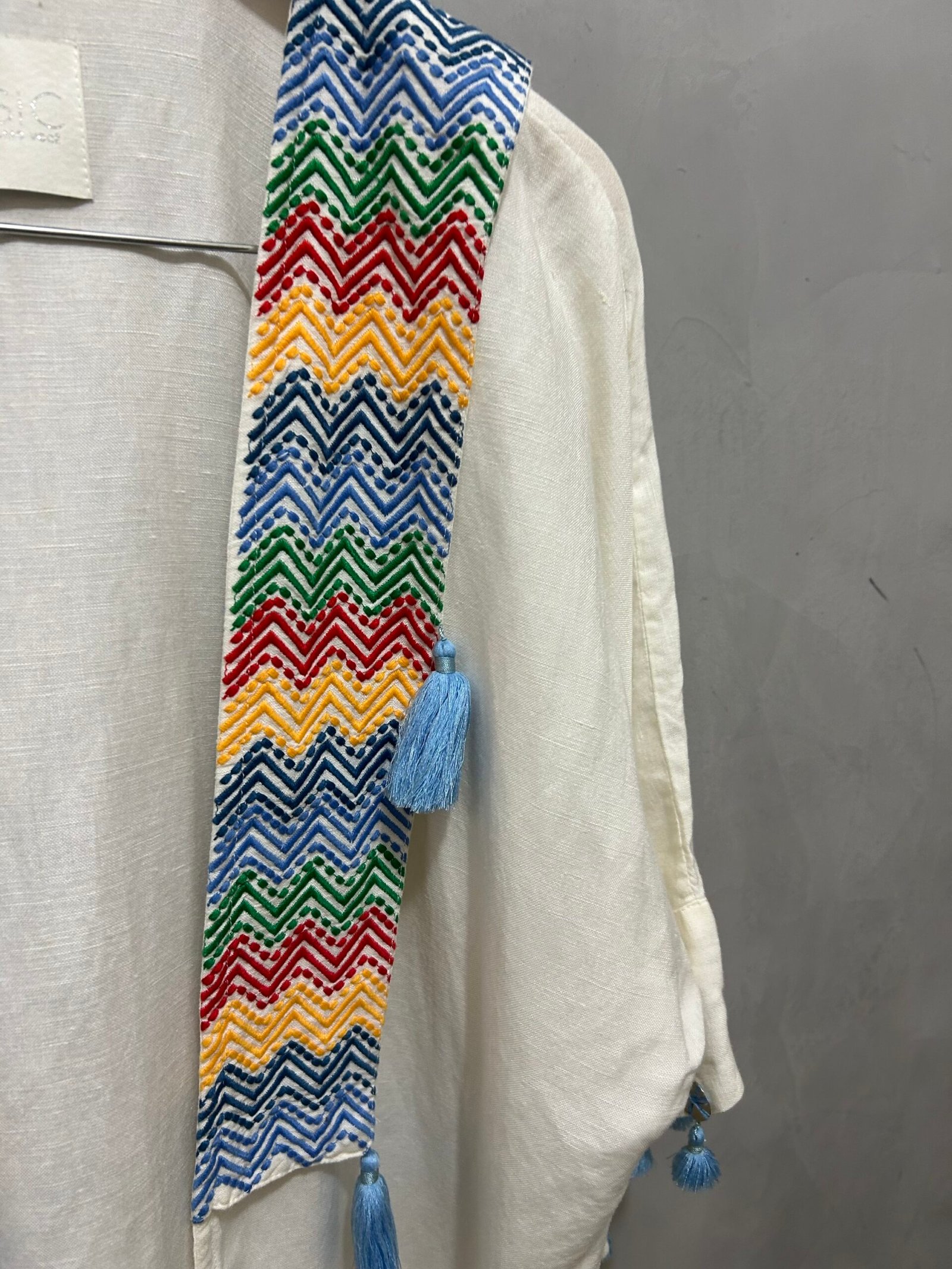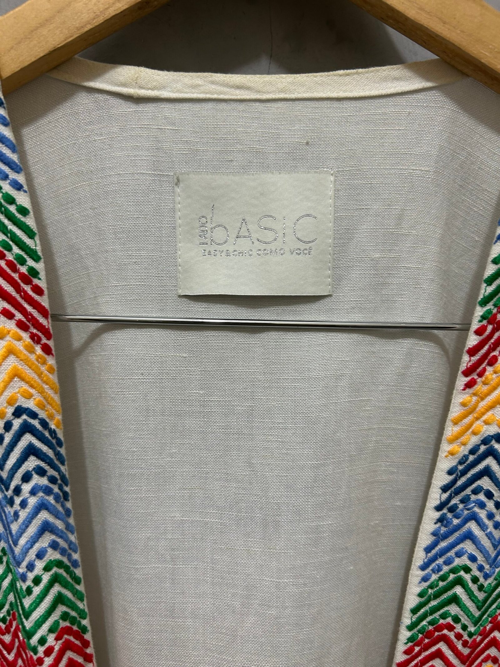 Quimono bordado com aplicações, em linho e algodão.