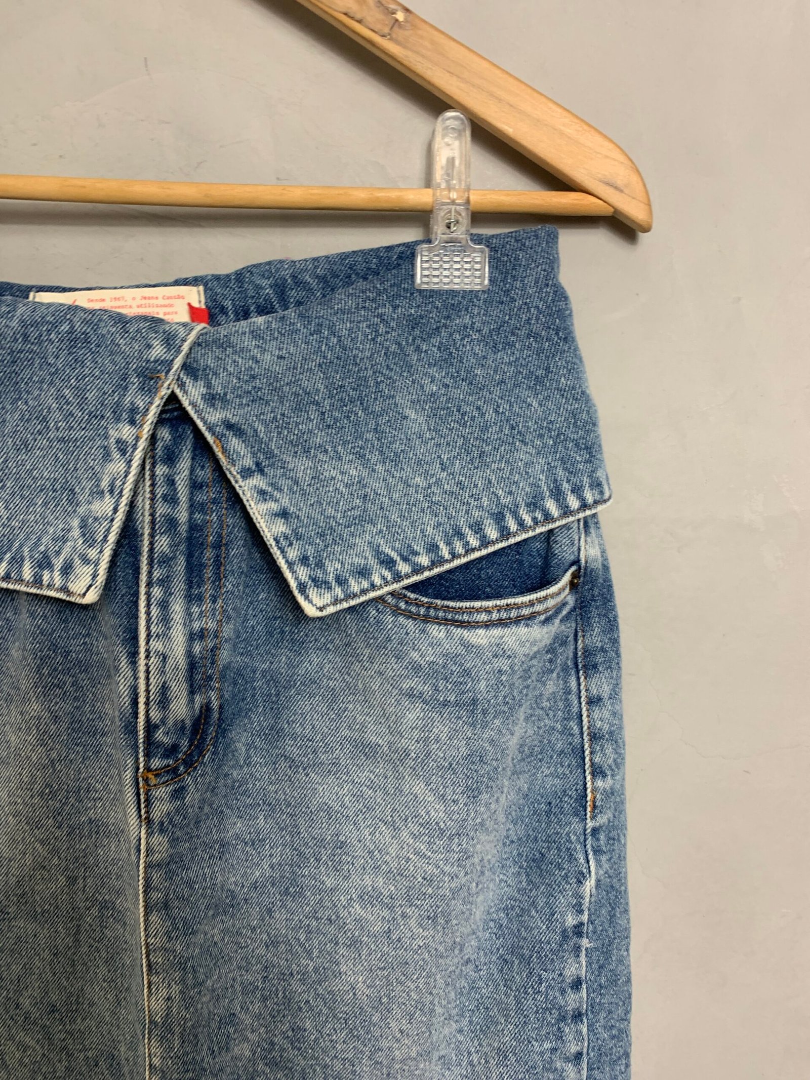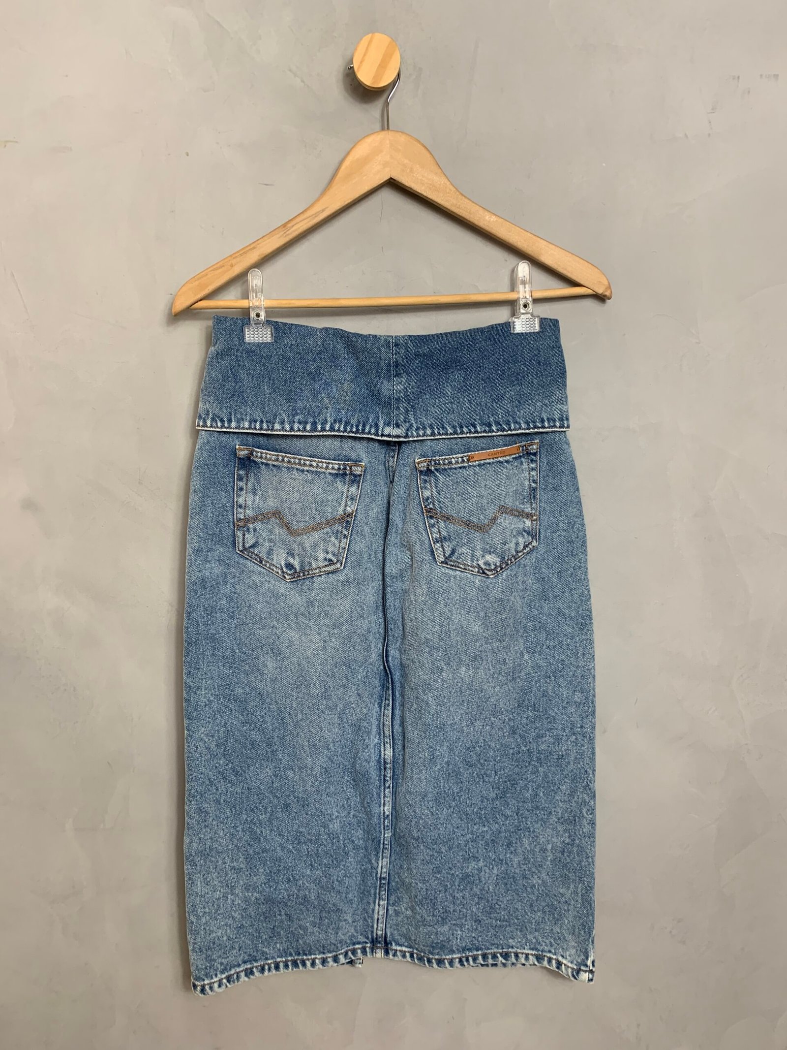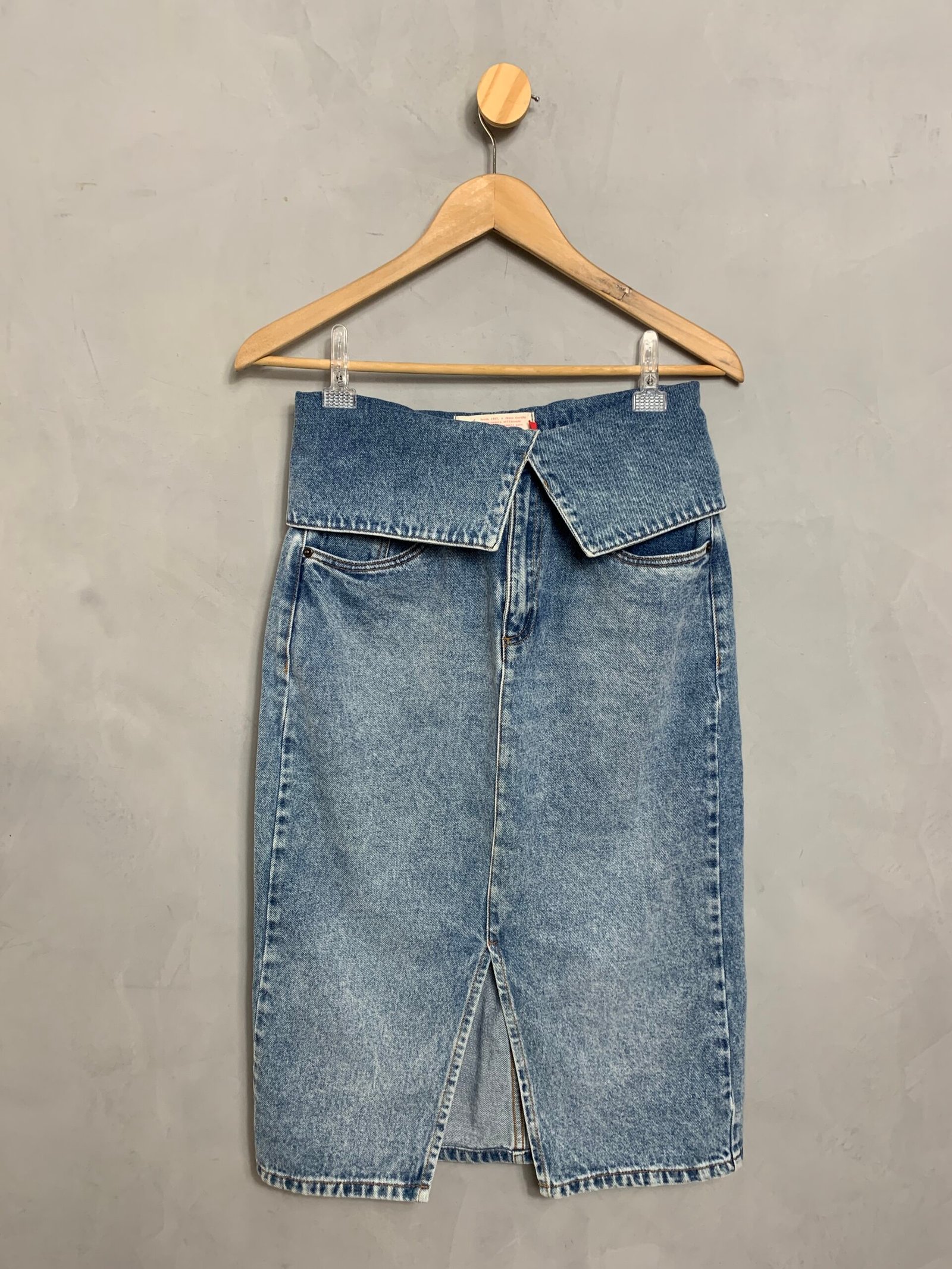 Saia jeans midi, com cós dobrado e fenda frontal. Sem elastano.